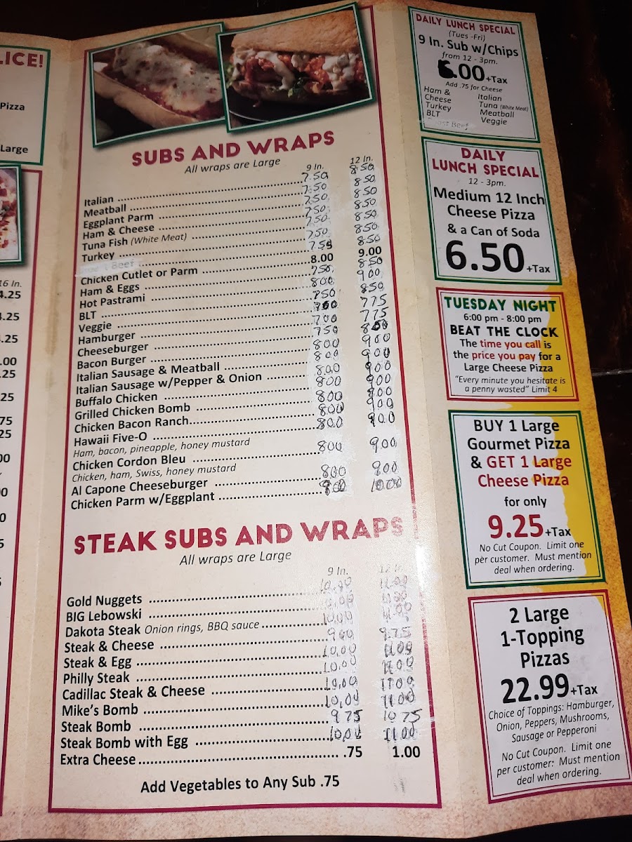 For those who crave something other than pizza, the restaurant also offers 11” Subs & Grinders, including the fan-favorite STEAK BOMB, STEAK & CHEESE, and the classic CHICKEN PARMIGIANA SUB. There’s also a great variety of 12" Calzones, with options like Meat Lovers Calzone, White Calzone, and Buffalo Chicken Blue Calzone, perfect for a filling meal.
