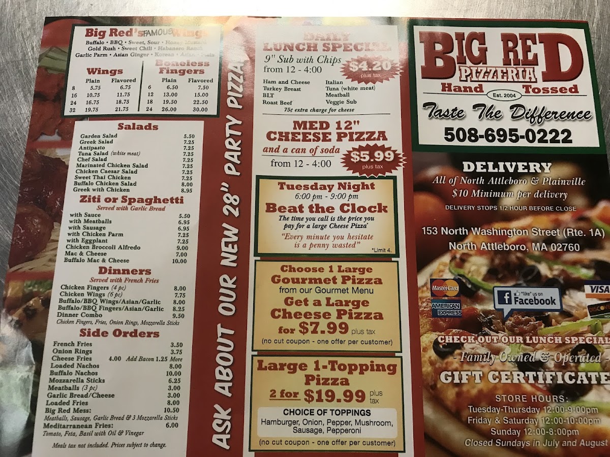 Slice Pizza House, also known as Kabylo's Pizza, located at 153 N Washington St, North Attleborough, MA, offers a broad and mouthwatering menu that caters to all tastes. The restaurant's 16" Pizzas are a standout, with options like the 16" Chicken Vodka Pizza, 16" House Special Pizza, and the 16" Meat Lovers Pizza. For something a little more adventurous, their 16" Pesto Honey Hot Pizza offers a unique balance of savory and sweet, while the 16" The Funway Pizza promises a fun twist on traditional pizza toppings. There’s also a 16" Half And Half Pizza for those who want to enjoy two flavors in one, and 12" Half And Half Pizza for smaller appetites.